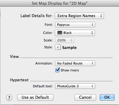 To do that, I simply chose Set Map Display from the Display menu. In the dialog that appeared, I chose Extra Region Names from the main pop-up menu, then changed the Color pop-up from Red to Black.