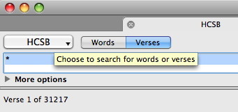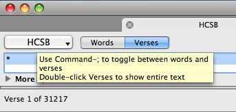 Instantly return to viewing the whole Bible: As you know, most Search windows in Accordance open in verse mode and have an asterisk in the entry box to show the entire text of the Bible. When you do a verse or word search, you typically see only those verses which meet your search criteria. To get back to viewing all the text, you would either need to enter an asterisk in verse mode or select the asterisk from the history pop-up, but some users asked for an easier way. In 8.3 you can simply double-click the Verses button to view the entire text.