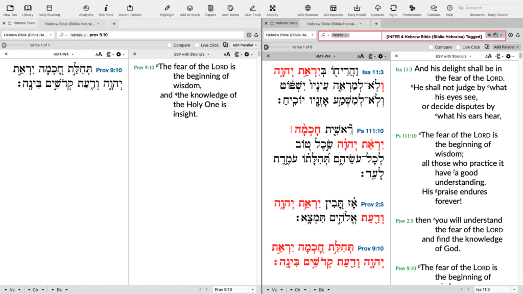 To use the INFER command, begin by establishing a base text. In this example, we will set up a Search window with the Hebrew Bible (BHS-W4 or other tagged Hebrew Bible) as a search text and an English Bible like the ESV in parallel. We’ll set this window to Search for verses, and then enter Proverbs 9:10.
