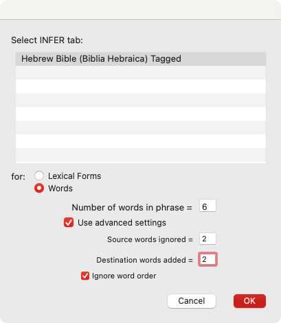 Since BHS-W4 is a tagged text, we also have the option to look for inferences based on the lexical forms (lemmas) of each word in the phrase, or to base our inference on the actual inflected forms (words) which are used in Proverbs 9:10. Let’s go ahead and set this option to Words.