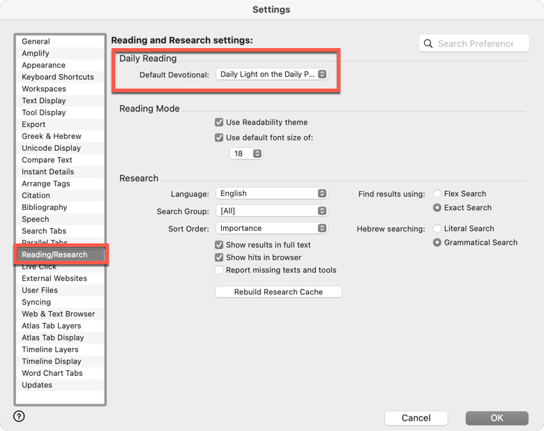 It is super-easy to make Daily Light on the Daily Path, or any devotional in Accordance, your preferred devotional. It is a simple adjustment in your Accordance Settings, then one-click from your main toolbar allows you to open the Daily Devotional view with your favorite devotional on the left-hand side and Scripture passages pertaining to your devotional on the right-hand side. Here are a couple of screenshots and a video illustrating how simple it is to set this up.