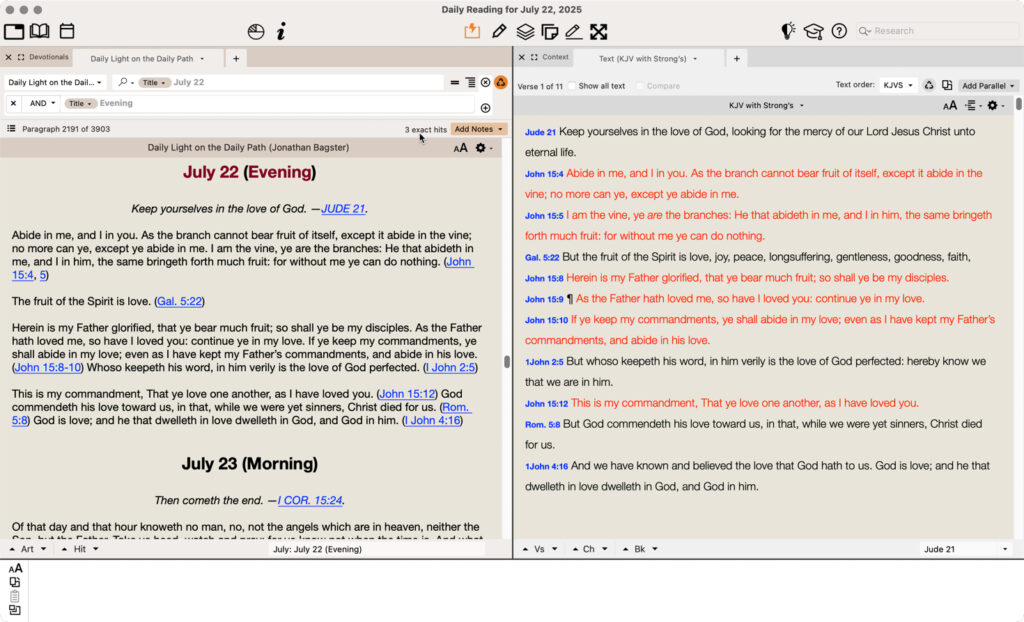 One of my favorite daily devotionals in my Accordance library is Daily Light on the Daily Path. I have read through this devotional every day for the past few years. I still find myself continuing to read through this devotional year after year, even if I do read another devotional along with it so that I can read a variety of daily devotionals over my years of personal quiet time with the Lord.